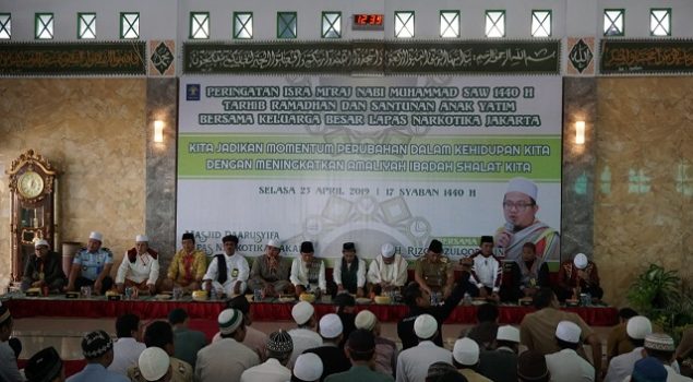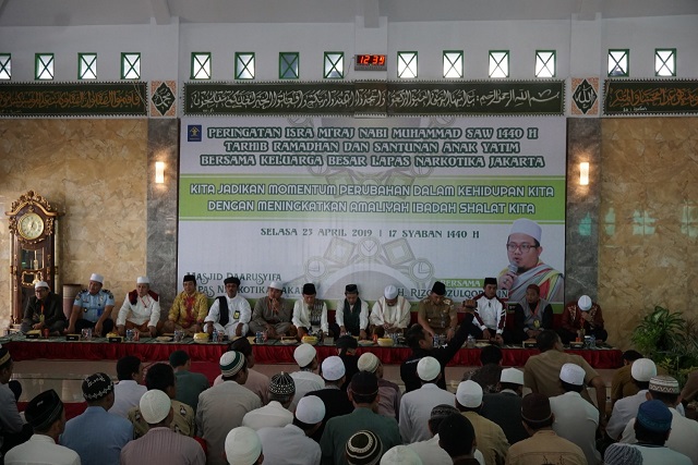 Jakarta, INFO_PAS – Lembaga Pemasyarakatan (Lapas) Kelas IIA Narkotika Jakarta menyelenggarakan peringatan Isra dan Mi’raj di Masjid Darusyifa, Selasa, (23/4). Peringatan tersebut dihadiri ratusan Warga Binaan Pemasyarakatan (WBP) dan jajaran Lapas Narkotika Jakarta, Wakil Walikota Jakarta Timur beserta jajarannya, 40 anak yatim wilayah sekitar Cipinang Jakarta Timur beserta tiga pendampingnya, Dewan Guru Pondok Pesantren Daarusyifa Jakarta, serta Rizqi Dzulqornain selaku penceramah.